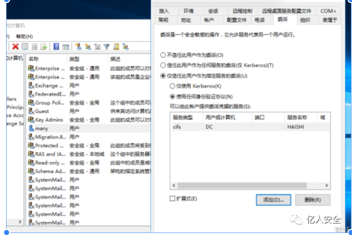 注意:能够被委派的用户只能是服务账号或者机器账号