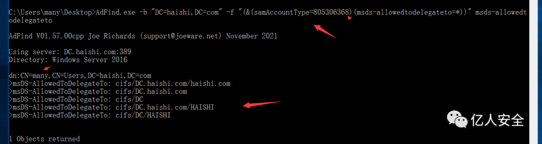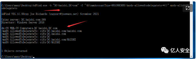 AdFind.exe -b "DC=haishi,DC=com" -f "(&(samAccountType=805306368)(msds-allowedtodelegateto=*))" msds-allowedtodelegateto