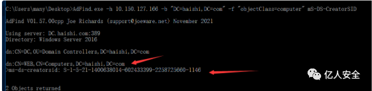 AdFind.exe -h 10.150.127.166 -b "DC=haishi,DC=com" -f "objectClass=computer" mS-DS-CreatorSID