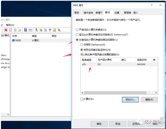 主机账号需设置委派时,只能设置为约束性委派;