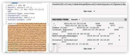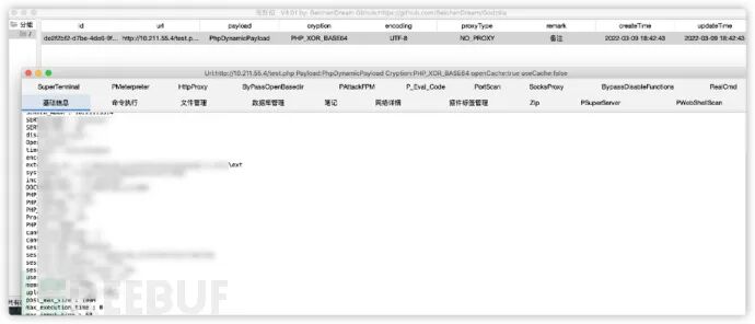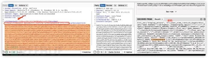 请求体中传递的payload为base64编码,并且存在固定的QGluaV9zZXQoImRpc3BsYXlfZXJyb3JzIiwiMCIpO0BzZXRfdGltZV9saW1pdCgwKTtpZihQSFBfVkVSU0lPTjwnNS4zLjAnKXtAc2V0X21hZ2ljX3F1b3Rlc19ydW50aW1lKDApO307ZWNobygiWEBZIik7J