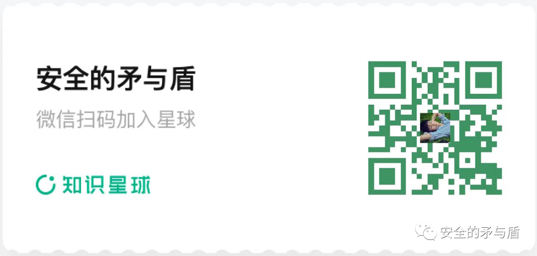 更多的干货内容,更深入的技术交流,尽在知识星球“安全的矛与盾”,欢迎大家扫码加入!有问题请咨询微信 Manliness_man