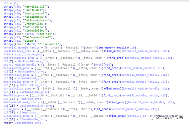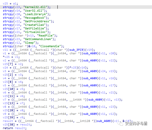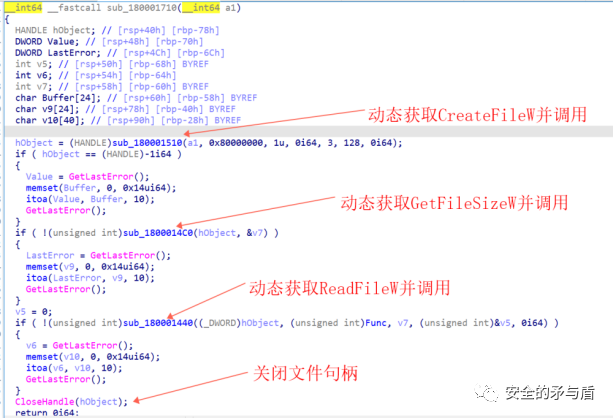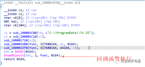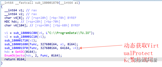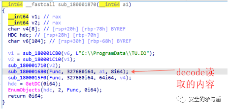 此时得到的v2依然为宽字符串"C:\ProgramData\TU.IO"。接下来调用sub_180001710并传入v2,经过调试分析,作者自实现了GetProcAddress函数,采用计算字符串Hash并比较的方式,规避调用系统GetProcAddress,以及隐藏导入表函数的敏感特征。函数sub_180001710的实际作用是读取传入文件名也就是C:\ProgramData\TU.IO到Func程序全局变量当中。