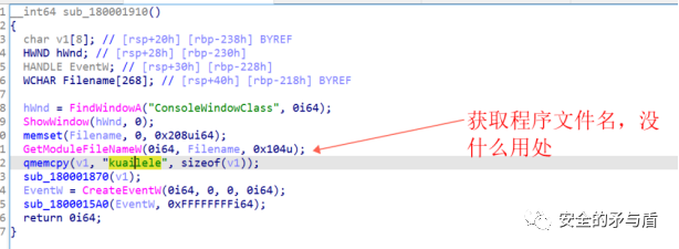 然后是获取程序的文件名,不过这个Filename始终没有被用到,猜测应该是之前从一些功能函数里copy的代码,没有删除不必要的函数调用。