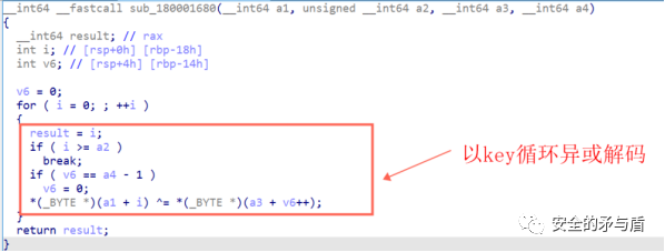 跟进函数sub_180001680,发现函数第一个参数是需要解码的buffer,第二个参数为buffer的长度,第三个参数也就是a1(这里是"kuailele")为key,第四个参数为key的长度,并且以key的长度-1为循环长度,对buffer的数据进行异或解码。这里存在一个问题,key的最后一个字节没有被用到,猜测可能是作者编写程序循环长度判断有些问题,这里正常应该以key的全部长度为循环异或解码。