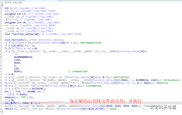 函数sub_1339经过调试,其作用为保存解码后的PE文件到文件当中,并执行该EXE文件。