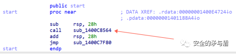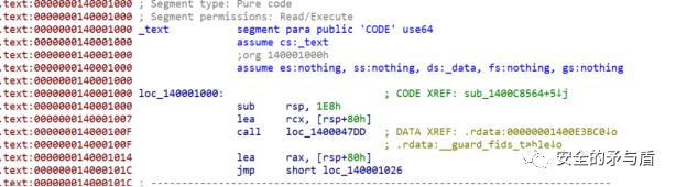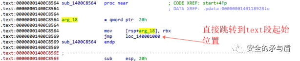 接下来对钓鱼木马.exe进行分析。IDA载入,发现在入口函数的第一个调用的函数,被做了手脚,突兀的出现一条直接跳转到text段起始地址的指令。