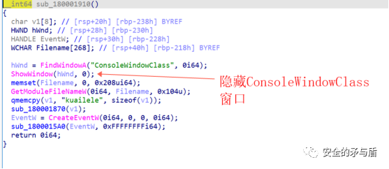 接着对loader函数进行分析。首先是调用ShowWindow隐藏MpCmdRun.exe进程的窗口。