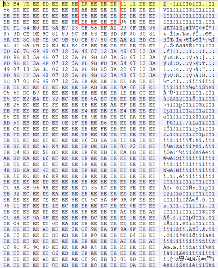 按照坤佬的统计,并且结合文件后半部分存在明文,可得知只是头部数据被0xEE异或混淆,大概在010Editor中查看数据后,发现前0x400字节存在问题,所以只需要对前0x400字节做0xEE异或即可。