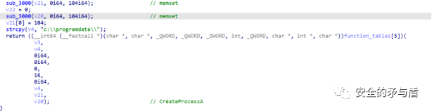 最后是调用函数CreateProcessA执行C:\ProgramData\MpCmdRun.exe加载恶意DLL执行stageless beacon shellcode上线CS。
