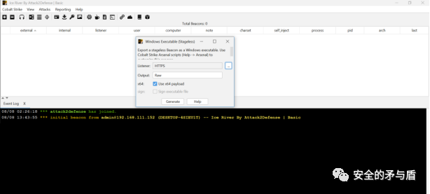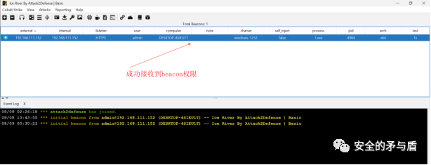 为了验证分析的结果是否正确,这里笔者用星球专版CS IceRiver生成一个64位的beacon.bin文件,并以"kuailele"为key通过循环异或对beacon.bin进行编码,将编码后的文件复制到"C:\ProgramData\TU.IO"文件当中,然后双击执行1.exe,观察IceRiver是否收到beacon权限。