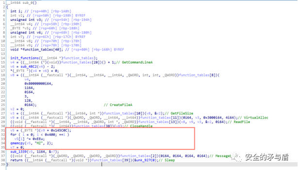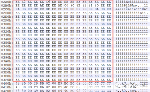 接着从偏移0x145C0C处,前0x400字节使用0xEE异或解码,最后复制MZ头到头部前2字节。这里操作为解码保存在当前程序当中的PE文件。