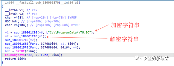 跟进函数sub_180001870,首先是对明文字符串进行加密、解密,最后还是明文字符串,这里搞不懂作者想干啥。