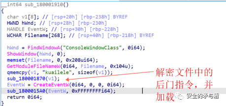 最后是loader的主要函数,以字符串"kuailele"为解密key解密文件当中的后门指令,并加载。
