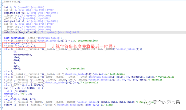 对上层调用函数进行注释。接着作者自己实现了strlen函数,然后对字符串最后一个字节置0,这里没有什么实质的作用,这里GetCommandLineA相当于获取了当前程序的路径。