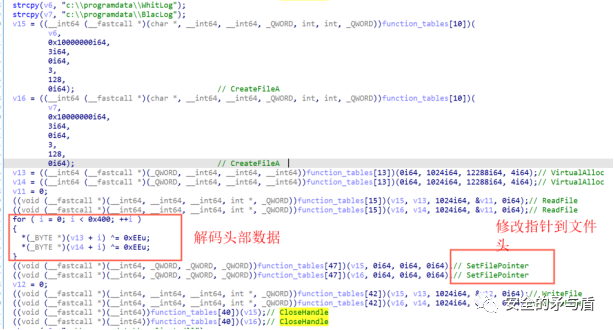 可以发现,与shellcode.bin的结构很相似,分析步骤相同,这里主要关注所做的动作。首先是从文件c:\programdata\WhitLog和c:\programdata\BlacLog中读取前面stage.exe下载保存的样本1、样本2的数据,再解码头部前0x400字节数据,再重新写入数据到文件当中。