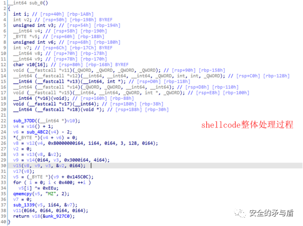 IDA中载入保存的shellcode.bin文件,以64 bit code反编译,在shellcode首地址创建函数,之后借助IDA F5大法反编译代码。