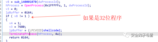 如果是32位程序,将会结束目标程序,什么也不干,并返回0。