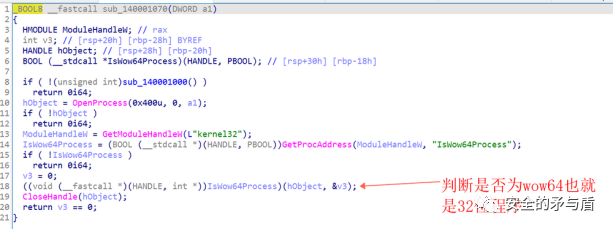函数sub_140001070的作用是判断目标进程是否为32位程序。