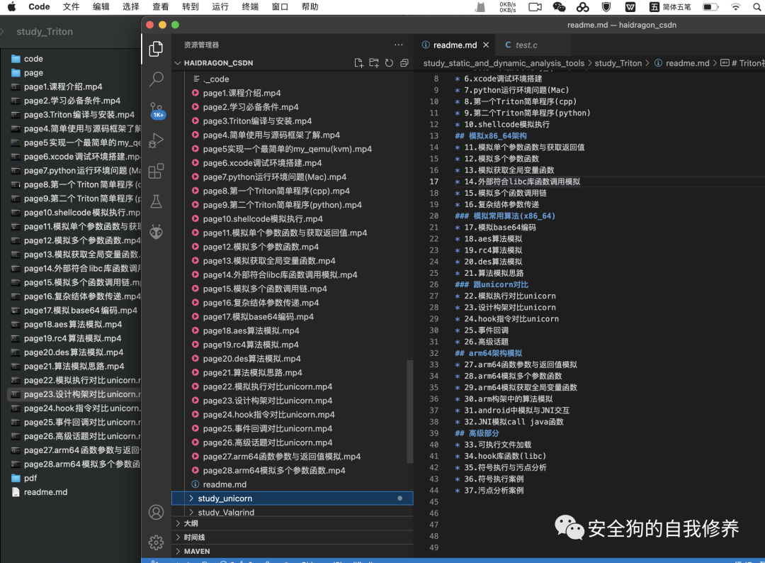 # unicorn源码分析与使用视频教程## 基础* 1.课程介绍* 2.unicorn源码编译* 3.unicorn简单使用与调试* 4.unicorn 源码框架了解* 5.实现一个最简单的my_qemu(kvm)* 6.shellcode 指令追踪使用* 7.shellcode 指令追踪源码分析* 8.使用中断事件hook源码分析 (syscall)* 9.使用中断事件hook源码分析(arm syscall)* 10.内存操作事件hook(读写执行)* 11.内存操作事件hook源码分析* 12.异常事件使用与源码分析* 13.再谈unicorn(框架定位与缺陷)## x86架构中使用* 14.模拟单个参数函数与获取返回值(x86_64构架)* 15.模拟多个参数函数(x86_64构架)* 16.模拟获取全局变量函数(x86_64构架)* 17.外部符合libc库函数调用模拟(x86_64构架)* 18.模拟多个函数调用链(x86_64构架)### 常用算法模拟* 19.模拟base64编码(x86_64构架)* 20.aes算法模拟(x86_64构架)* 21.des算法模拟(x86_64构架)* 22.rc4算法模拟(x86_64构架)* 23.其它算法模拟思路(x86_64构架)## arm架构中使用* 24.模拟单个参数函数与获取返回值(arm64构架)* 25.模拟多个参数函数(arm64构架)* 26.模拟获取全局变量函数(arm64构架)* 27.arm构架中的算法模拟(arm64构架)* 28.android中模拟与JNI交互(arm64构架)* 29.JNI模拟call java函数(arm64构架)## 完善unicorn* 30.unicorn ELF文件模拟* 31.unicorn 其它可执行文件* 32.unicorn调试器介绍## ollvm混淆* 33.unicorn结合capstone使用* 34.生成CFG(控制流程图)* 35.ollvm反混淆思路