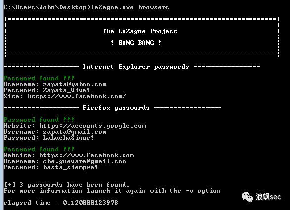 laZagne.exe all -password ZapataVive注意:对于 wifi 密码 \ Windows Secrets,以管理员权限启动它(UAC Authentication / sudo)