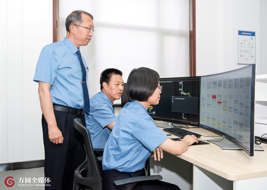毛奕宏(左一)与同事讨论如何完善电子数据检验报告。(图片来源:受访者供图)