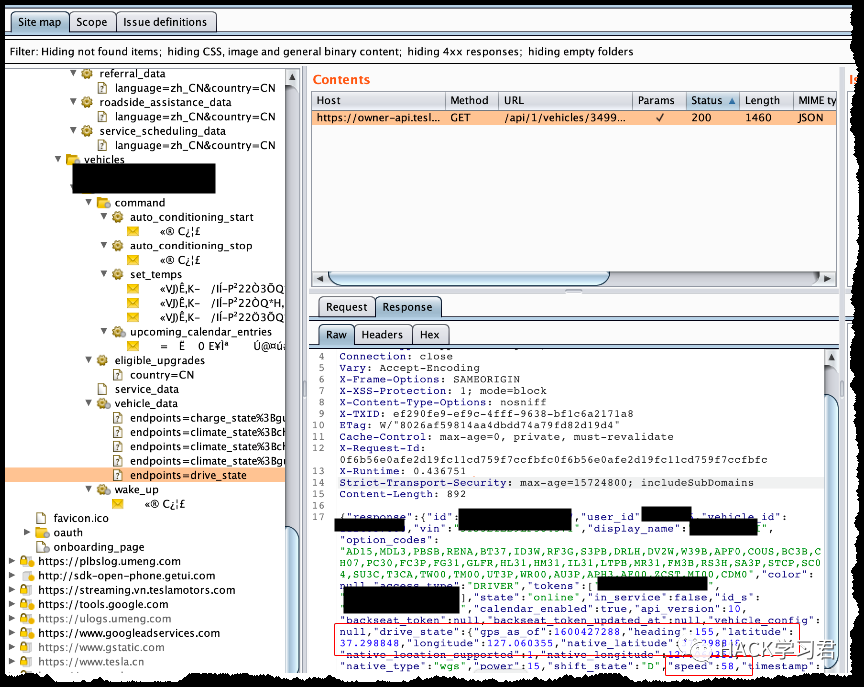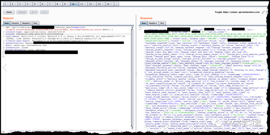 通过记录可以看到获取车辆详细信息的api地址为/api/1/vehicles/{vehicle_id}/vehicle_data ,通过抓取停止状态和行驶状态下的数据,可以看到由endpoints参数控制,值分别为drive_state(行驶中)、climate_state%3Bgui_settings,climate_state%3Bcharge_state%3Bdrive_state%3Bgui_settings%3Bvehicle_state。