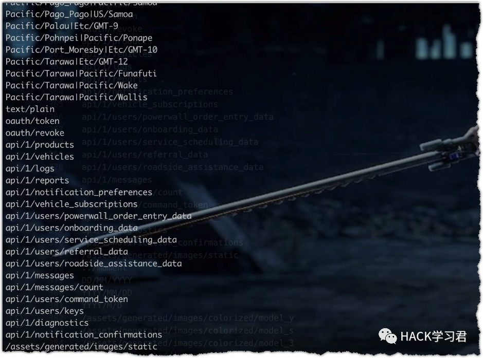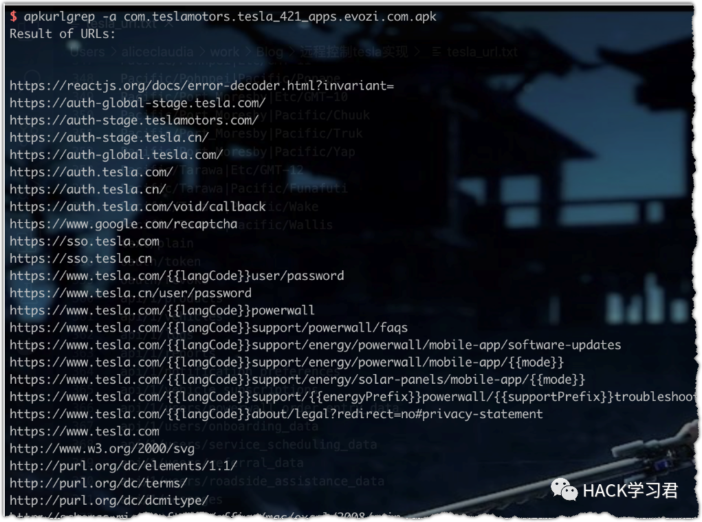 安装完成后,执行apkurlgrep -a com.teslamotors.tesla.apk 等待显示结果即可。也可以将结果重定向到文件中。结果里有一些是多余的,找到一些我们关注的点即可。这里关注到有api的地址owner-api.teslamotors.com的地址,和带有api关键字的路径内容。