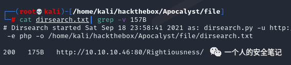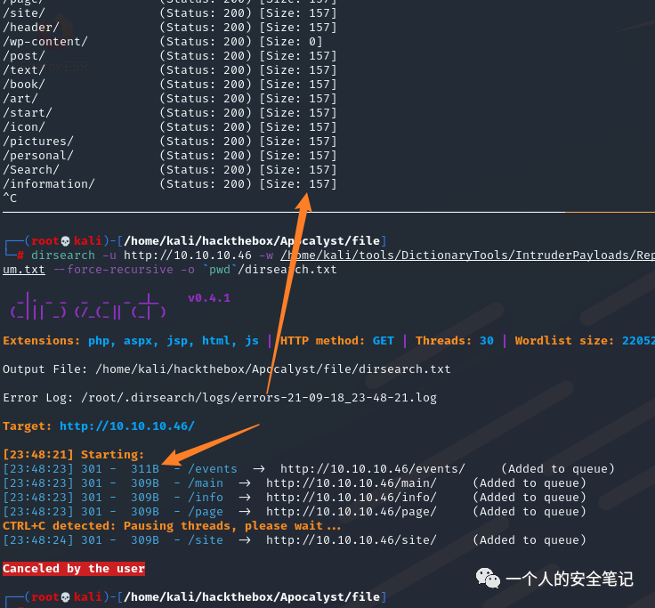 $ gobuster dir -u http://apocalyst.htb -w /home/kali/tools/DictionaryTools/IntruderPayloads/Repositories/SecLists/Discovery/Web-Content/directory-list-2.3-medium.txt -k -f -t 30这里有个问题,就是使用 gobuster 进行枚举时,返回的 Size 值一直在固定的区间(可能是我当时没加 -r 参数导致),对结果的判断不够明显,改为使用 dirsearch 进行扫描: