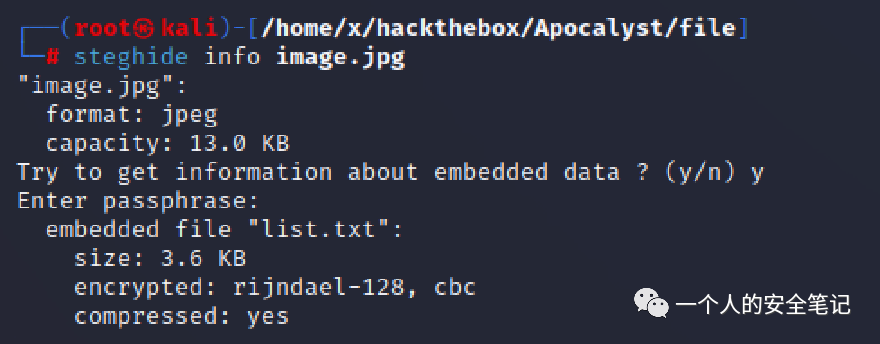 图片下载至本地使用 exiftool、binwalk 分析后均没发现什么异常,根据CTF图片隐写相关进行搜索发现 steghide 工具,使用它对图片进行信息查看时发现存在隐藏内容: