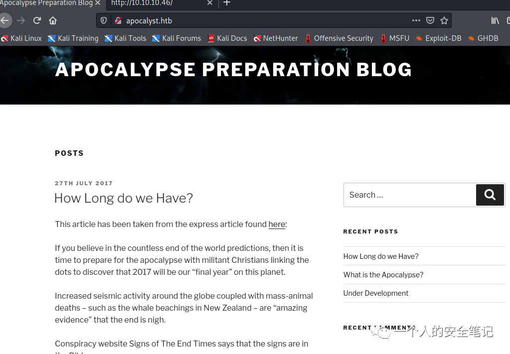 |_http-title: Apocalypse Preparation Blog可以看到暴漏的端口仅有两个,且从 http-generator 中可以得到 Web 服务的指纹信息,说明这又是一道 Web Box。