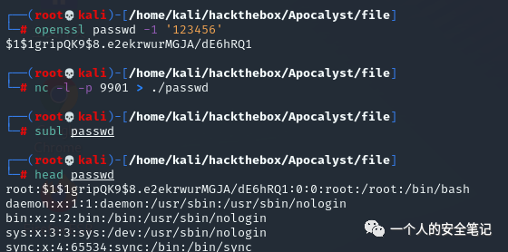 使用 openssl 生成一个自定义的密码哈希,将它写入到 /etc/passwd 文件中: