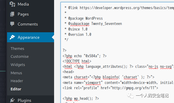 ...snip...接下来就比较简单了,使用这个密码成功进入 wp 的管理后台,找到主题编辑功能写入自定义的 PHP WebShell: