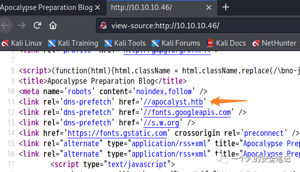 通过查看页面源代码可以获知当前站点的虚拟主机域名为:apocalyst.htb,通过 hosts 绑定后访问发现站点并没有出现新的变化。
