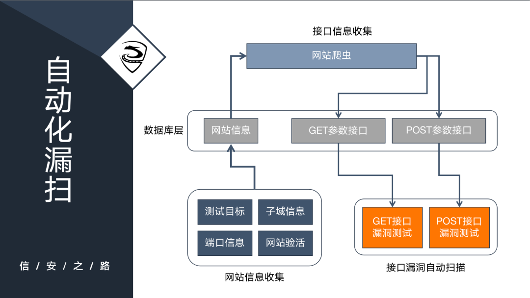 对于常规漏洞而言,主要是 owasp top 漏洞,这类漏洞需要我们使用一些辅助扫描器来进行,比如 xray 、awvs 等漏洞扫描工具,我的自动化系统架构如图:
