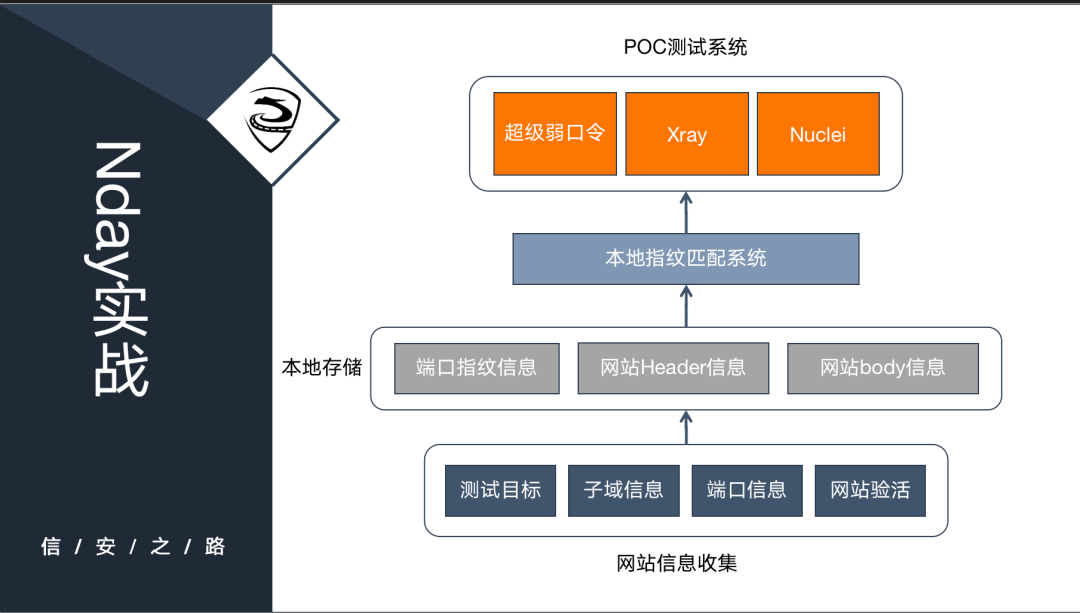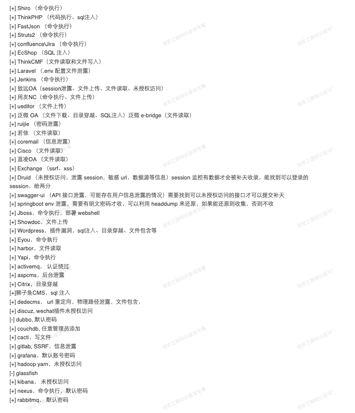 nday 漏洞也就是一些通用系统存在漏洞,在发布修复补丁之后的一段时间,部分企业没有及时更新系统,从而导致漏洞一直存在,这给企业的安全留下了巨大隐患,这部分漏洞发现是比较容易的,只要能够发现相关资产就能快速发现漏洞,我的发现方式如图: