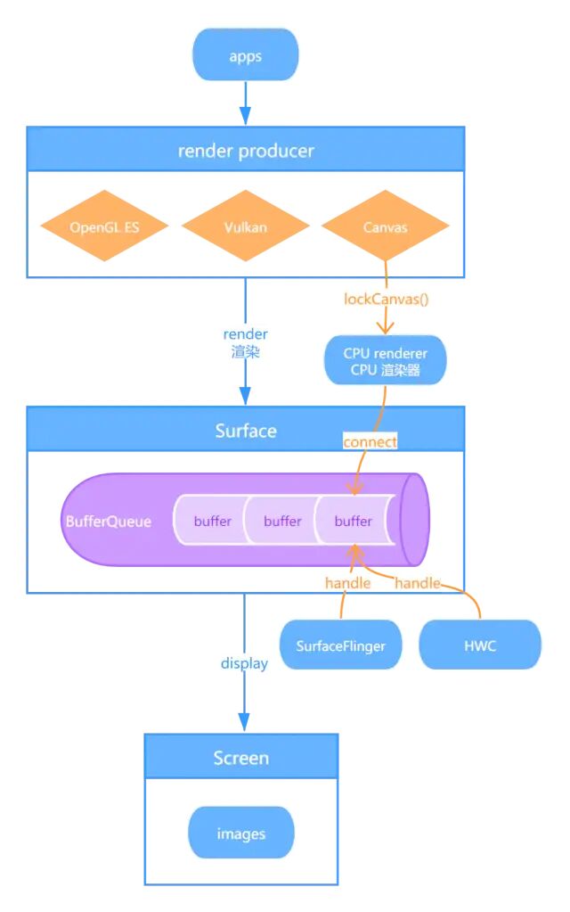 Surface: contains the BufferQueue. 一个供Image Stream生产者和Image Consumer交换buffers的接口。它包含BufferQuene。使应用可以渲染要显示在屏幕上的Images。