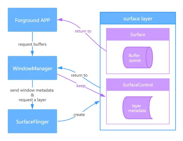 SurfaceFlinger creates the layer and sends it to WindowManager. WindowManager then sends ther surface to the app, but keeps the SurfaceControl. 如图: