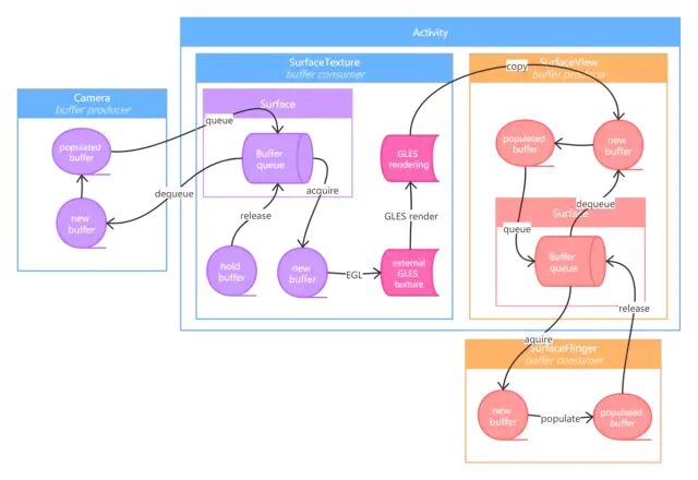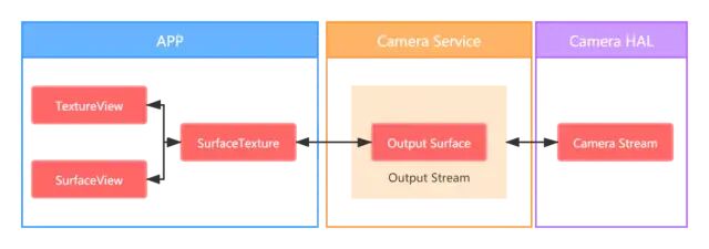 Camera的数据渲染到SurfaceTexture提供给它的Surface上,然后再把这些数据渲染到TextureView所属Window的Surface上,或渲染到SurfaceView自己的Surface上。