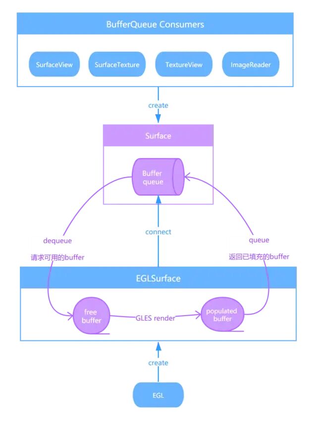 这个方法不仅创建一个EGLSurface,还会把创建的EGLSurface连接到做为输入参数的Surface的BufferQueue上(做为BufferQueue的生产方),而这个Surface由BufferQueue的消耗方(SurfaceView、SurfaceTexture、TextureView或者ImageReader等)创建。